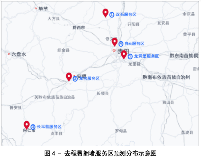 预计2026年“五一”期间,去程高峰当日,省内较易拥堵的服务区主要有:G7512筑蓉高速(下行)-双石服务区、G60沪昆高速(上行)-龙宫服务区、G7612纳兴高速(下行)-长耳营服务区、梅福塘大桥(下行)-白云服务区、G6002贵阳绕城高速(下行)-龙洞堡服务区等。