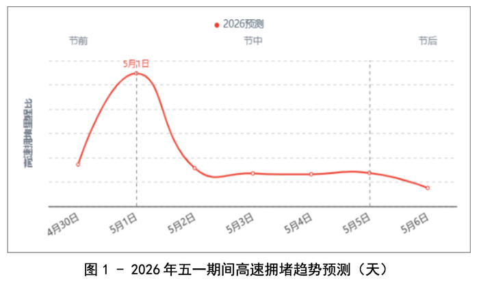 预计2026年“五一”期间,省内在节前出行峰值将会发生在4月30日23点。同时,预计节中期间,5月1日11点将迎来出行高峰,拥堵里程占比最高,出行热度较高。而节后,预计在5月6日23点拥堵里程占比最高,相较节中拥堵有所缓解。