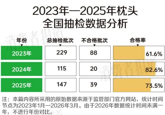 近日,《消费者报道》记者梳理了国家市场监督管理总局及各省市级市场监督管理局近三年多(2023年1月—2026年4月)来发布的枕头抽检情况。