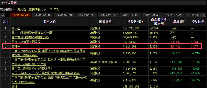 值得一提的是,章建平还在2025年四季度继续增持了AI芯片龙头寒武纪。 据寒武纪此前发布的2025年年报显示,与三季报相比,第五大股东章建平持仓增加40.84万股至681.49万股,占总股本比例1.62%。按今日收盘价计算,其持 股市值约93.67亿元。
