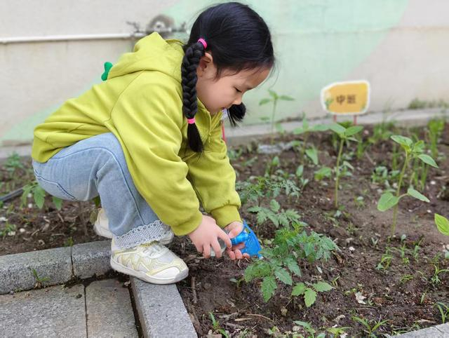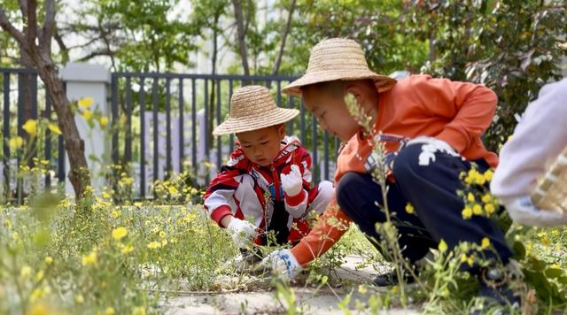 “菜篮子”的探秘不只发生在菜市场。丰台区政府机关幼儿园的种植区里,孩子们每天蹲在菜畦旁,看自己播下的种子有没有冒头,给刚长出来的小苗浇水,拔掉旁边的杂草。“老师你看,昨天它还没这么高呢!”一个女孩指着菜苗兴奋地喊。丰台五幼的孩子们则被老师带到了户外,蹲在花圃边仔细观察。“这片叶子边缘像小锯子,闻起来有点怪怪的。”“这个我认识,我奶奶包过饺子!”孩子们你一言我一语,在触摸和嗅闻中认识了荠菜、马齿苋等多种可食用野菜。