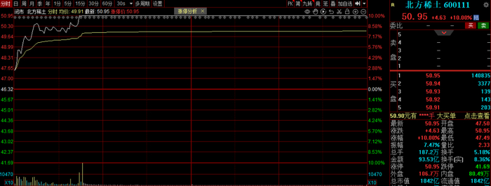 昨日北方稀土发布一季报,知名牛散章建平新进北方稀土前十大流通股东,持股比例达到2%,位居该公司第四大股东。受此消息提振,稀土永磁板块今日大涨,北方稀土、中国稀土、盛和资源纷纷涨停。