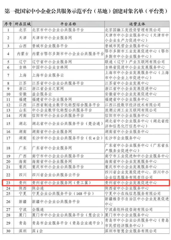 贵州1平台入选首批国家中小企业公共服务示范平台(基地)创建对象名单