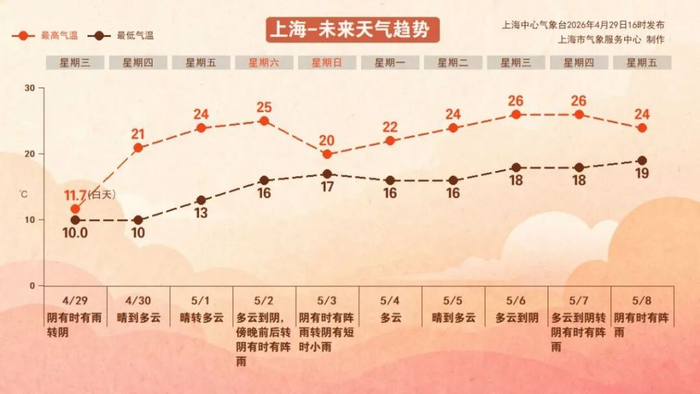 节后首个工作日,上海将以多云天气为主,气温进一步上升,日最高气温接近26℃。8日前后会有一次降雨天气过程。