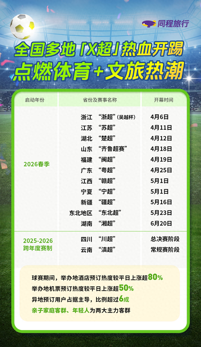 继“村超”“苏超”现象级爆火出圈后,2026年春季,全国多地加入草根足球狂欢,汇聚成一股“春超”热。4月上旬至今,浙江“浙超”、湖北“楚超”、广东“粤超”、福建“闽超”等多个省级足球联赛热血开踢。同程旅行数据显示,截至4月28日,足球联赛举办地搜索量月环比涨超300%,异地预订用户占比超过六成,“看一场球,游一座城”成为这个春天的热门旅行方式。