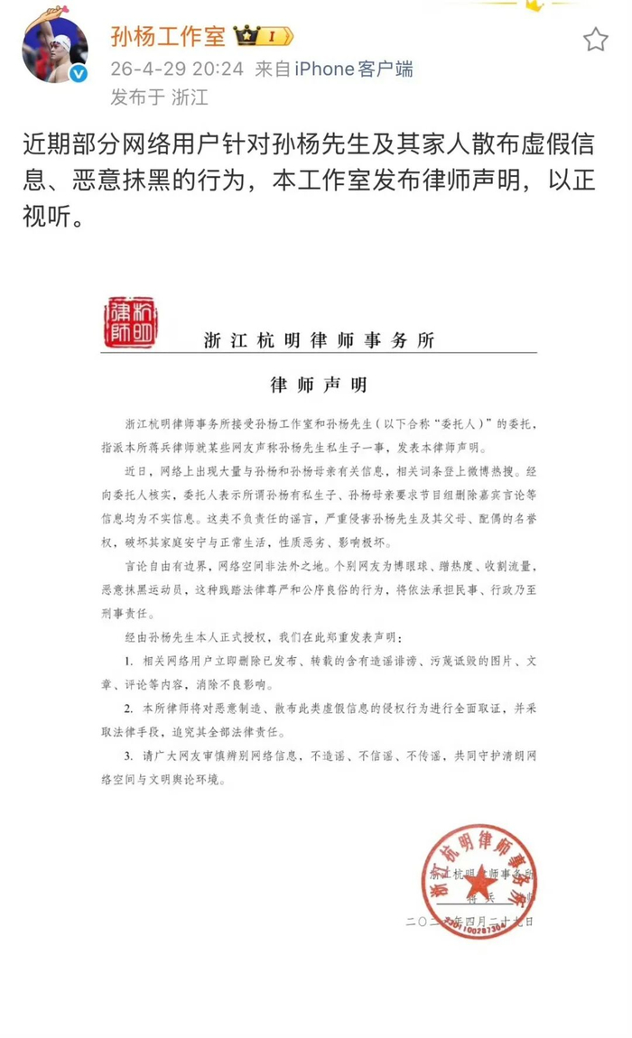 29日晚20:24,孙杨工作室发布律师声明,声明提到,网传孙杨有私生子、孙杨母亲要求节目组删除嘉宾言论等信息“均为不实信息”,“这类不负责任的谣言,严重侵害孙杨先生及其父母、配偶的名誉权,破坏其家庭安宁与正常生活,性质恶劣、影响极坏”。
