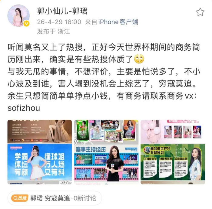 16:00,微博认证为“体育主持人”的郭珺发布微博提到,“与我无瓜的事情,不想评价,主要是怕说多了,不小心波及到谁,害人塌到没机会上综艺了,穷寇莫追。”