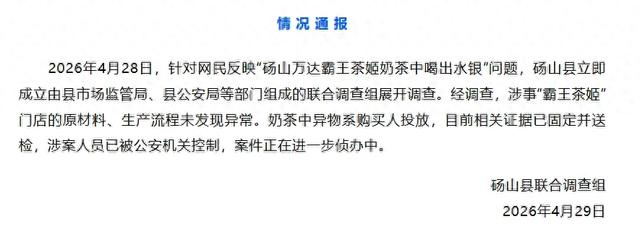 4月28日,针对网民反映“砀山万达霸王茶姬奶茶中喝出水银”问题,砀山县立即成立由县市场监管局、县公安局等部门组成的联合调查组展开调查。经调查,涉事“霸王茶姬”门店的原材料、生产流程未发现异常。奶茶中异物系购买人投放,目前相关证据已固定并送检,涉案人员已被公安机关控制,案件正在进一步侦办中。
