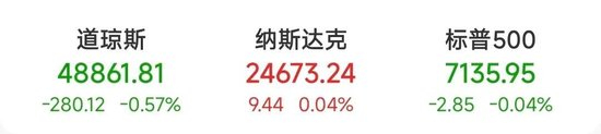 当地时间4月29日,美股三大指数收盘涨跌不一。截至收盘,道指跌280.12点,跌幅为0.57%,报48861.81点;纳指涨9.44点,涨幅为0.04%,报24673.24点;标普500指数跌2.85点,跌幅为0.04%,报7135.95点。