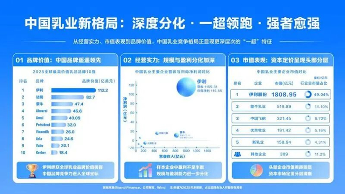 2025年,伊利实现营业总收入1159.31亿元,归母净利润115.65亿元,同比增长36.82%,以前瞻性均衡业务结构布局,重塑乳业增长逻辑,成为唯一实现营收利润“双增”的综合性乳企,中国乳业“一超”断层式领先格局再次深化。