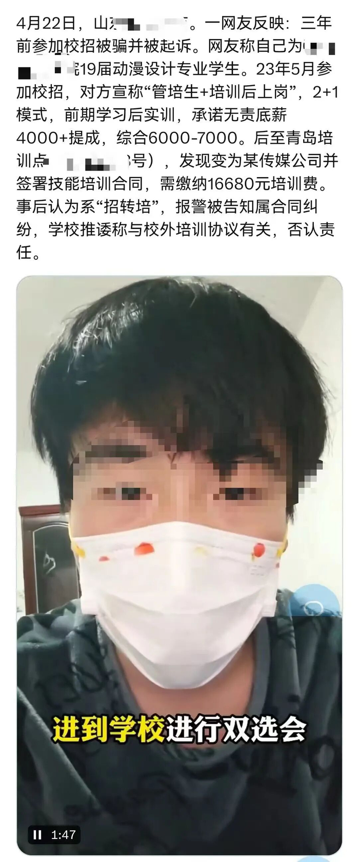 警惕校招中也有“招转培”电诈!山东某学院的学生遭遇骗局 学校推诿责任! 市场资讯 04.30 16:41 (来源:道福斯)警惕!现在校招也不安全!此前有学生被招聘去电诈公司上班,现在直接去诈骗学生的“招转培”电诈!