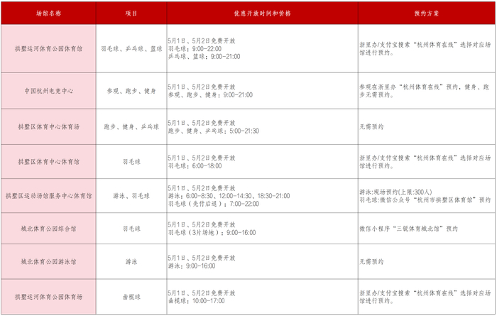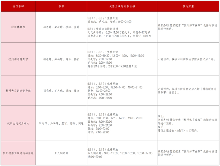 杭州体育馆、杭州游泳健身馆、杭州大关游泳健身馆、杭州全民健身中心、杭州模型无线电运动基地5个体育场馆向大众惠民开放。