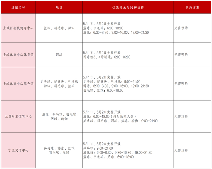 上城区全民健身中心、上城体育中心体育馆、上城体育中心综合馆、九堡阿里体育中心、丁兰文体中心5个体育场馆向大众惠民开放。
