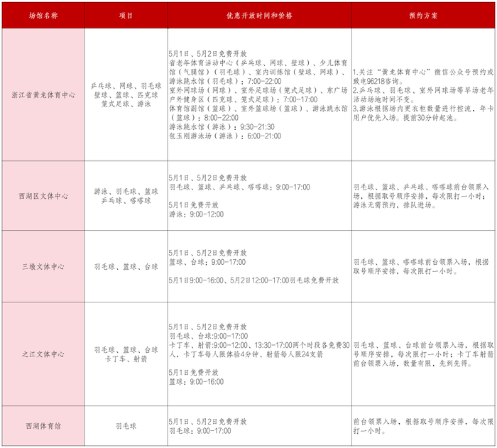 浙江省黄龙体育中心、西湖区文体中心、三墩文体中心、之江文体中心、西湖体育馆5个体育场馆向大众惠民开放。