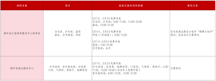 桐庐县江南体育健身中心体育馆、桐庐县城北健身中心2个体育场馆向大众惠民开放羽毛球、乒乓球、篮球、游泳、跑步、网球、气排球、地掷球、台球等,部分项目仅对老年人免费开放,具体请看下图。