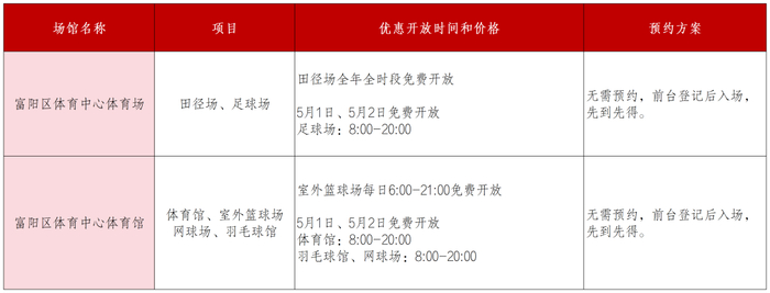 富阳区体育中心体育场、富阳区体育中心体育馆2个体育场馆向大众惠民开放田径场、足球场、体育馆、室外篮球场、网球场、羽毛球馆。