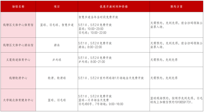 钱塘区文体中心体育馆、钱塘区文体中心游泳馆、义蓬街道体育中心、钱塘轮滑中心、大学城北体育健身中心5个体育场馆向大众惠民开放。