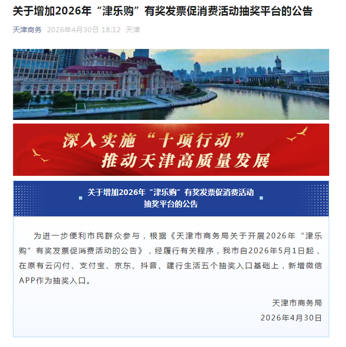 为进一步便利市民群众参与,根据《天津市商务局关于开展2026年“津乐购”有奖发票促消费活动的公告》,经履行有关程序,我市自2026年5月1日起,在原有云闪付、支付宝、京东、抖音、建行生活五个抽奖入口基础上,新增微信APP作为抽奖入口。