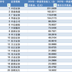 2026年一季度净利润排名前20的上市券商