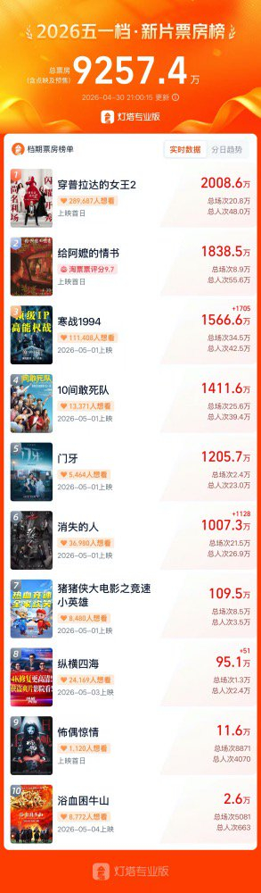 灯塔专业版数据显示,截至4月30日21时,五一档票房(含点映及预售)达9257万元,《穿普拉达的女王2》《给阿嬷的情书》《寒战1994》《10间敢死队》《门牙》《消失的人》暂列新片票房榜前六,均已破千万元。