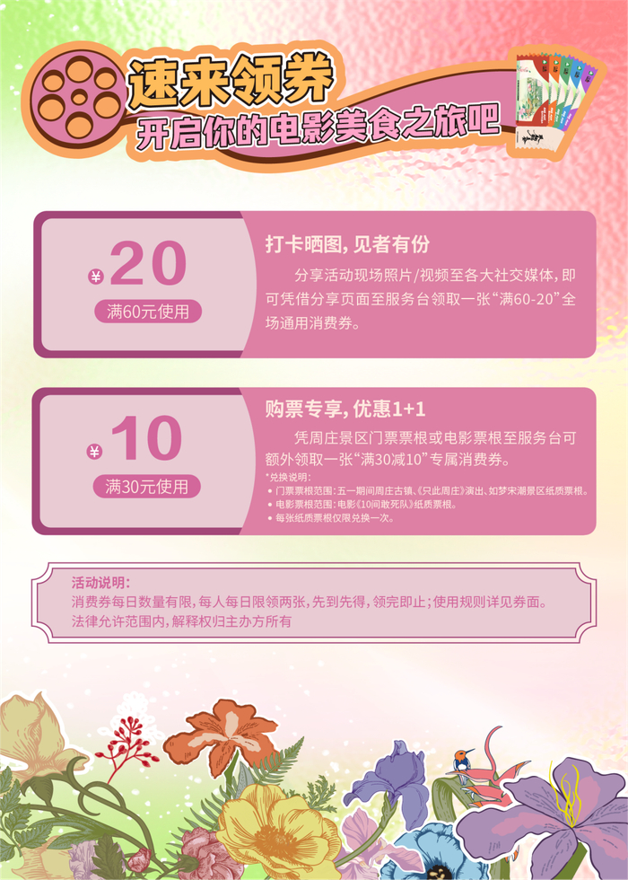 现场福利多多,动动手指,就能领“满60减20”普惠券,文创周边、轻食美味统统安排!还可凭实体电影票根兑换“满30减10”专属消费券,当日有效、直接抵扣,福利还可叠加使用,让舌尖美味与光影浪漫双向奔赴。