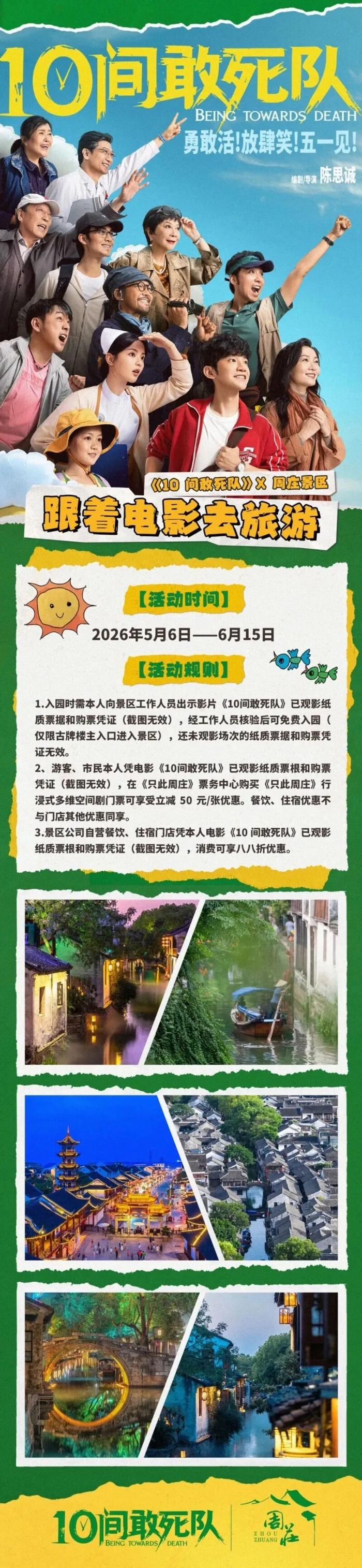 5月6日—6月15日,凭《10间敢死队》已观影纸质票根及购票凭证,即可免费游览周庄古镇;购买《只此周庄》行浸式多维空间剧门票可享立减50元优惠;在莼鲈之思度假酒店、沈厅酒家等景区自营门店消费,可享88折专属折扣。