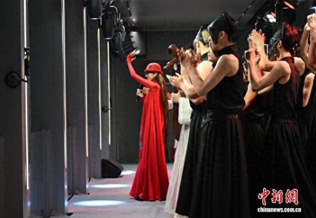 4月30日,杨丽萍在西子廊桥上和游人互动。当日,著名舞蹈艺术家杨丽萍作品《十面埋伏》在浙江杭州西湖畔的西子廊桥上演,颇具东方美学的视听呈现吸引游人驻足欣赏。中新社记者 王刚 摄