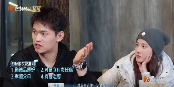 比如,孙杨可能忘记了,说话声音再小,他衣服上别的麦克风也会把每一个字收得清清楚楚,那些把妻子拉到一旁低声埋怨的话,被单独剪辑出来,就会显得格外刺耳,也让他容易被贴上“情绪不稳定”“以自我为中心”“太要面子”的标签。尤其在与其他嘉宾的对比下,会显得很不成熟。