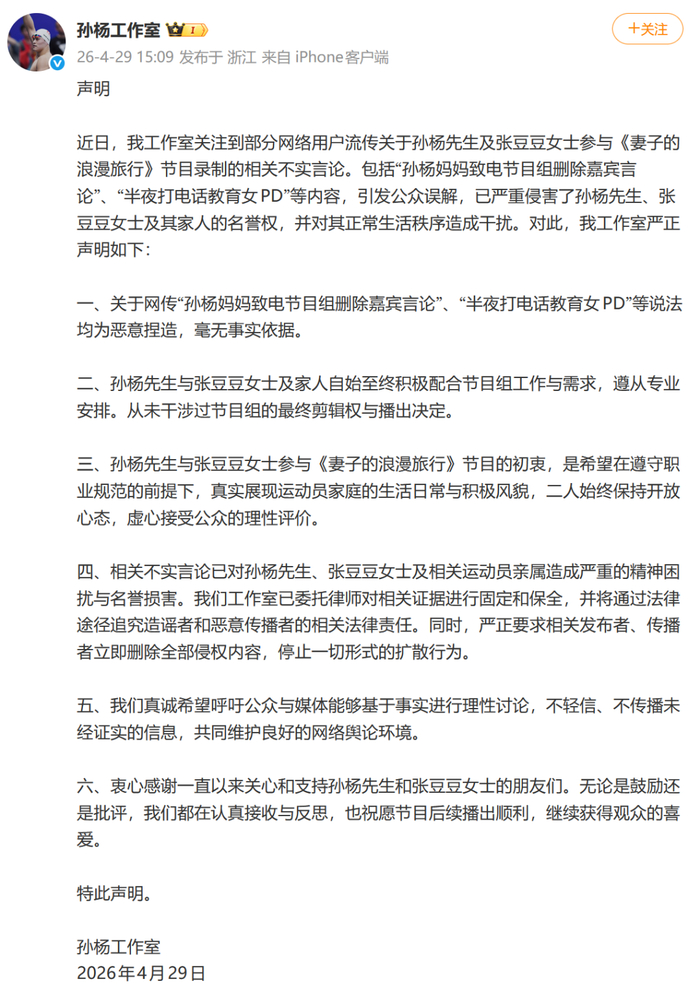 但孙杨工作室发声否认,称网传“孙杨妈妈致电节目组删除嘉宾言论”“半夜打电话教育女PD”等说法均为恶意捏造,毫无事实依据,并称孙杨夫妇和家人始终配合节目组工作与需求,从未干涉过剪辑和播出决定。