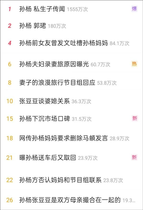 另一边,孙杨携妻子张豆豆参加《妻子的浪漫旅行2026》,却接连陷入争议,“妈宝”“控制欲”“以自我为中心”等标签一个接一个往他身上贴,牵出一系列质疑,工作室不得不发声明辟谣“私生子”“孙母干预剪辑”等网络传闻。今天(4月30日)他又上了热搜第一,词条是博士入学资格受质疑。