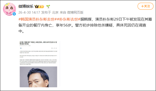 据都市快报,韩媒称演员朴东彬29日下午被发现在其筹备开业的餐厅内身亡,享年56岁。警方初步排除他杀嫌疑,具体死因仍在调查中。