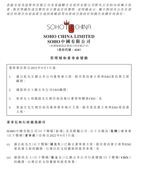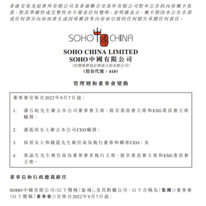 SOHO中国9月7日午间在港交所公告,潘石屹已辞去董事会主席、提名委员会主席和ESG委员会主席的职务,以专注于支持艺术和慈善事业;潘张欣已辞去公司行政总裁(CEO)职务,以专注于支持艺术和慈善事业。自2022年9月7日起,徐晋和钱霆被任命为执行董事和联席CEO;黄晶生被任命为董事会非执行主席、提名委员会主席和ESG委员会主席。