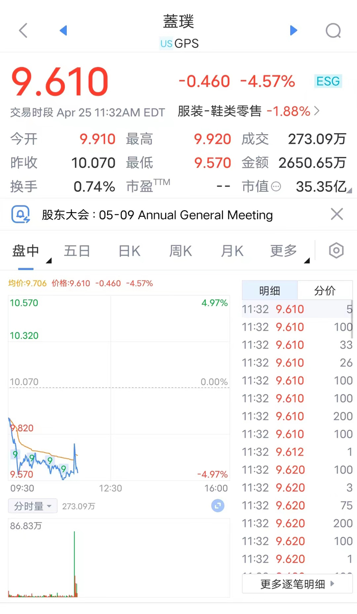 据知情人士透露,Gap将在全球裁员数百人,这是该公司大规模重组的一部分,目的是使公司更加灵活,减少官僚作风。其中一位知情人士说,本轮裁员的规模预计将超过9月份裁掉的约500个公司职位。这些裁员主要是在旧金山和纽约的主要办公室,是每年节省约2.5亿美元的努力的一部分。该公司计划本周通知旧金山总部的员工可能会裁员。备忘录显示,财务团队将在5月底得到通知。截至1月底,Gap在全球雇佣了约9.5万名员工,其中大部分在零售店工作。截至周一收盘,该公司股价过去12个月累计下跌14%。Gap(GPS)目前下跌4.1%,报9.66美元,徘徊于日低9.57美元附近。