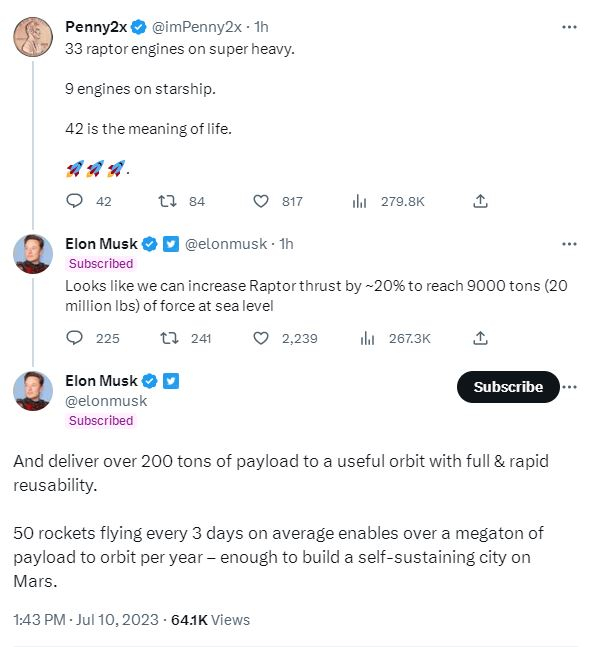 马斯克周日分享了一张“星舰”飞船的照片,展示了它的6个“猛禽”引擎,并说:“再加3个引擎,就能实现生命的意义。”一位推特用户写道:“(星舰的)超重型助推器上有33个猛禽引擎。飞船上有9个引擎。42就是生命的意义。”马斯克回应称:“看起来我们可以将猛禽的推力提高20%,在海平面上达到9000吨(2000万磅)的力量。并将超过200吨的有效载荷交付到有效轨道,并具有完全和快速的可重复使用性。平均每3天发射50枚火箭,每年将超过1百万吨的有效载荷送入轨道,足以在火星上建造一座自给自足的城市。”(环球市场播报)