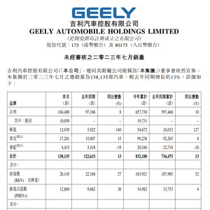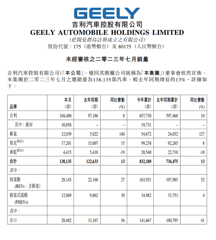 吉利汽车7月销量13.8万辆 同比增长13% 媒体滚动 2023.08.02 06:16 吉利汽车联交所公告,7月总销量为13.8135万部汽车,较去年同期增长约13%。其中,银河销量1.0058万辆,极氪1.2039万辆同比增长140%。