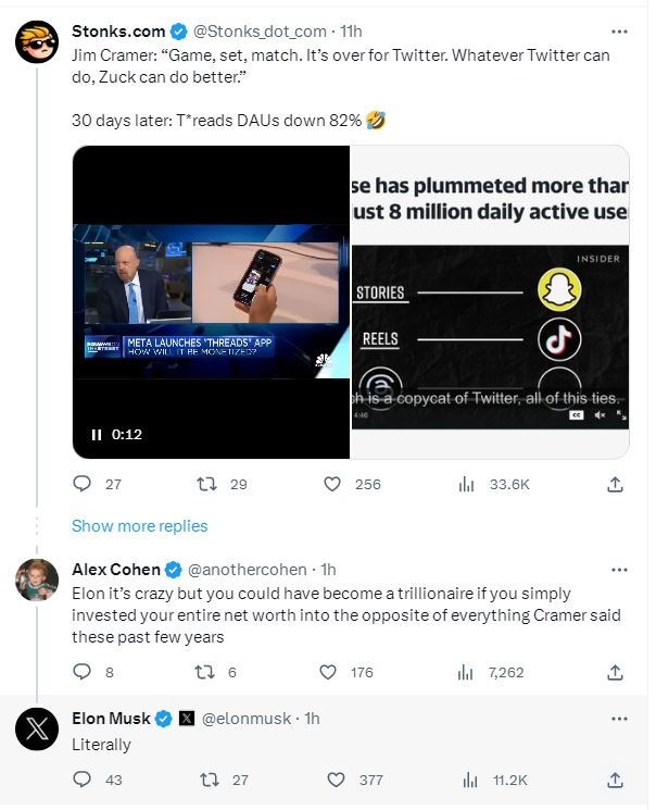 马斯克周日回应了一位X用户的帖子,同意他的说法,即如果他总是沿着和美国知名股评人吉姆·克莱默建议相反的反向来投资股票,那么早就成为地球上首位万亿美元富翁了。在Meta刚推出与推特竞争的社交平台Threads时,克莱默曾说:“推特的时代结束了。无论推特能做什么,扎克伯格都能做得更好。”而30天后,Threads的日活用户比刚上线时暴跌了82%。一位用户评论称:“埃隆,这很疯狂,但如果你把你的全部净资产都投到过去几年克莱默所说的相反的地方,你就可以成为一个万亿美元富翁。”马斯克回应称:“千真万确。”
