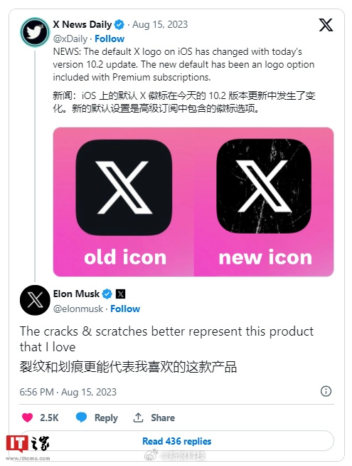 Twitter 老板马斯克最近对该平台进行了一系列的改革,包括更名为 X,以及更换新的应用图标。近日网友发现,X App 的图标又有了些许变化。次的变化是在黑色背景上加了一些白色的“破损”效果,似乎是想表达一种“垃圾”风格。但是,这种设计看起来并不时髦,反而像是在拼命迎合年轻人的口味。用户们纷纷在 X 上嘲讽这种“装酷”的尝试,认为这与 X 原来的小鸟图标相比简直是天壤之别。