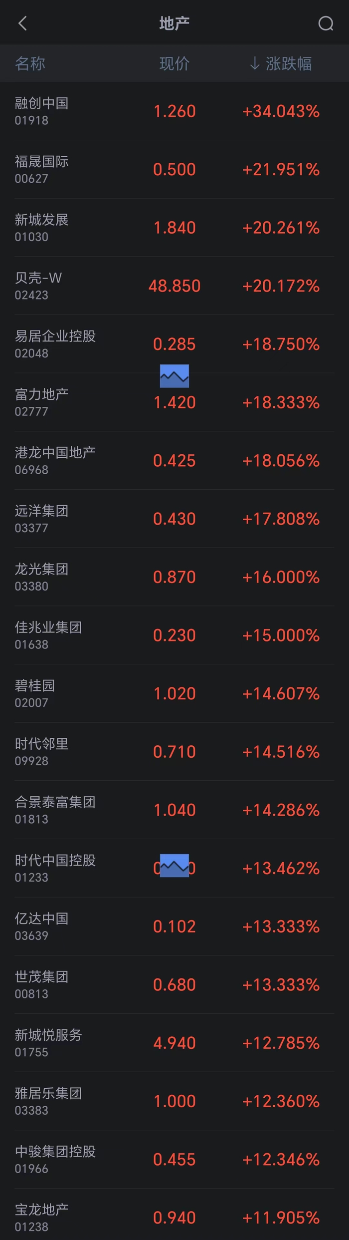 今日港股内房股集体井喷,超20只个股涨超10%,融创涨超34% 媒体滚动 2023.09.04 13:01 港股内房股集体走高,截至午间收盘,整个板块涨幅达8.49%。越秀地产、绿城中国、宝能地产、华润置地、龙湖集团、远洋集团、龙光集团等超20只个股涨幅超10%,融创中国涨幅达34.04%。