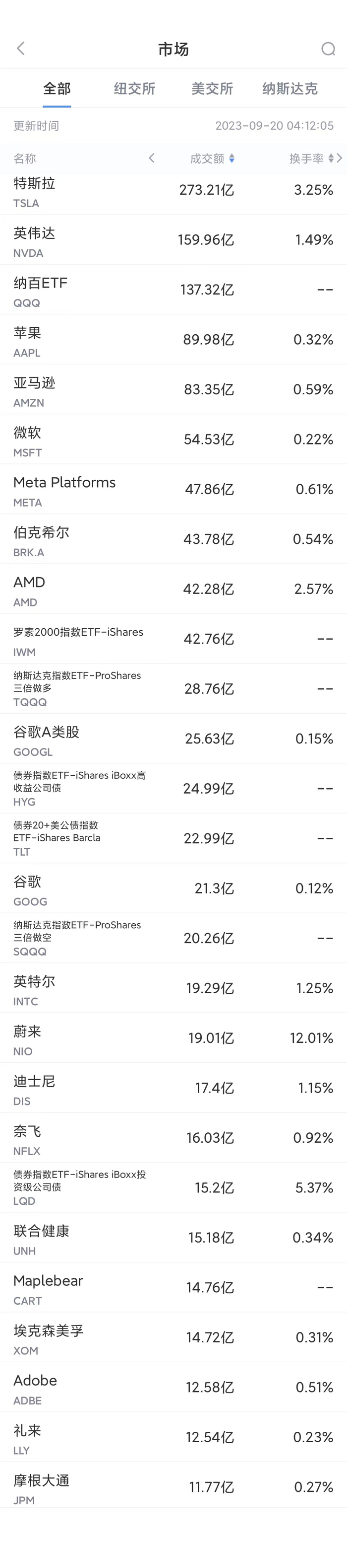 9月19日美股成交额前20:蔚来拟发行10亿美元可转债,股价下跌17%
