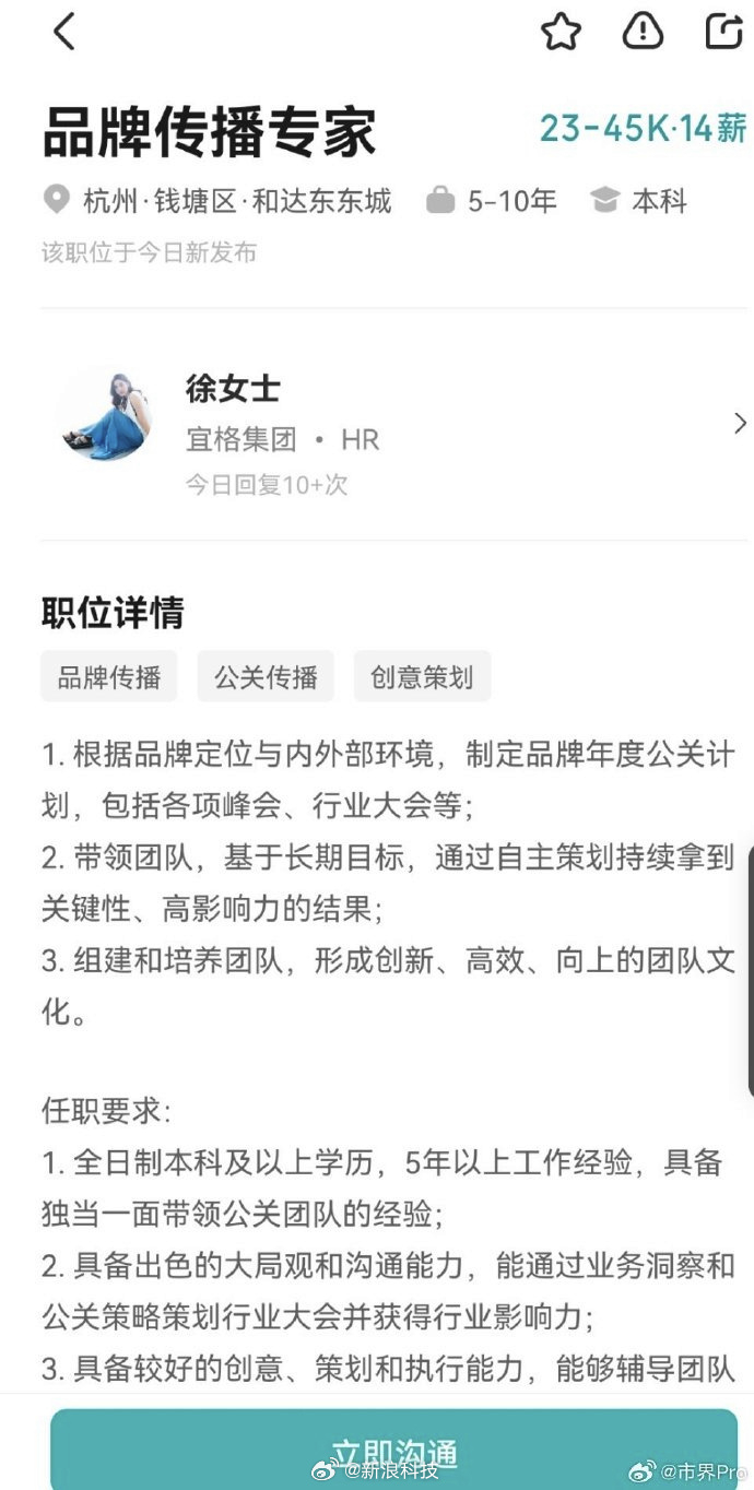 9月19日,花西子发布《一封信》回应”李佳琦带货翻车事件“引发热议,再次将这家国货美妆企业送到了风口浪尖上。花西子母公司宜格集团今日发布了招聘品牌传播专家信息,月薪范围为23—45k。以14薪计算,年薪最高可达63万。