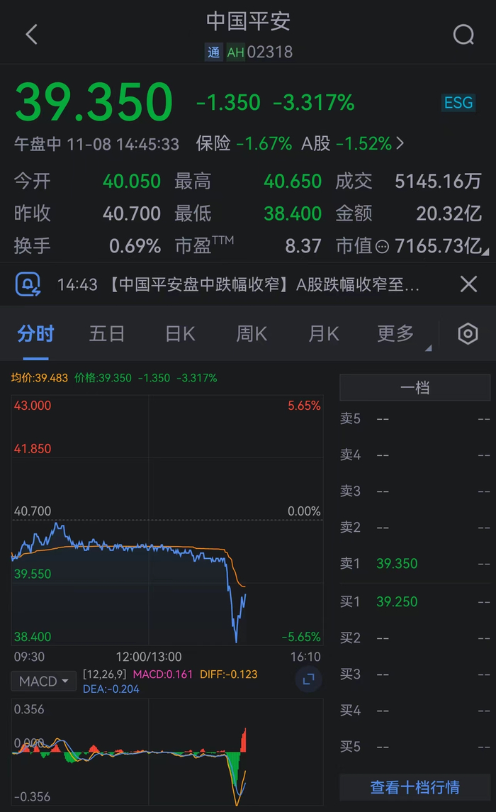 中国平安盘中跌幅收窄