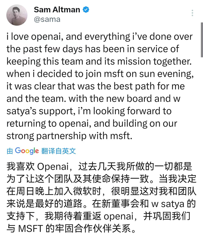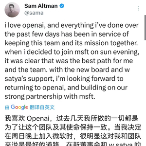 Sam Altman:期待着回到OpenAI 媒体滚动 2023.11.22 14:11 Sam Altman表示,在微软CEO纳德拉的支持下重返OpenAI。他表示期待着回到OpenAI,并与微软建立牢固的合作伙伴关系。