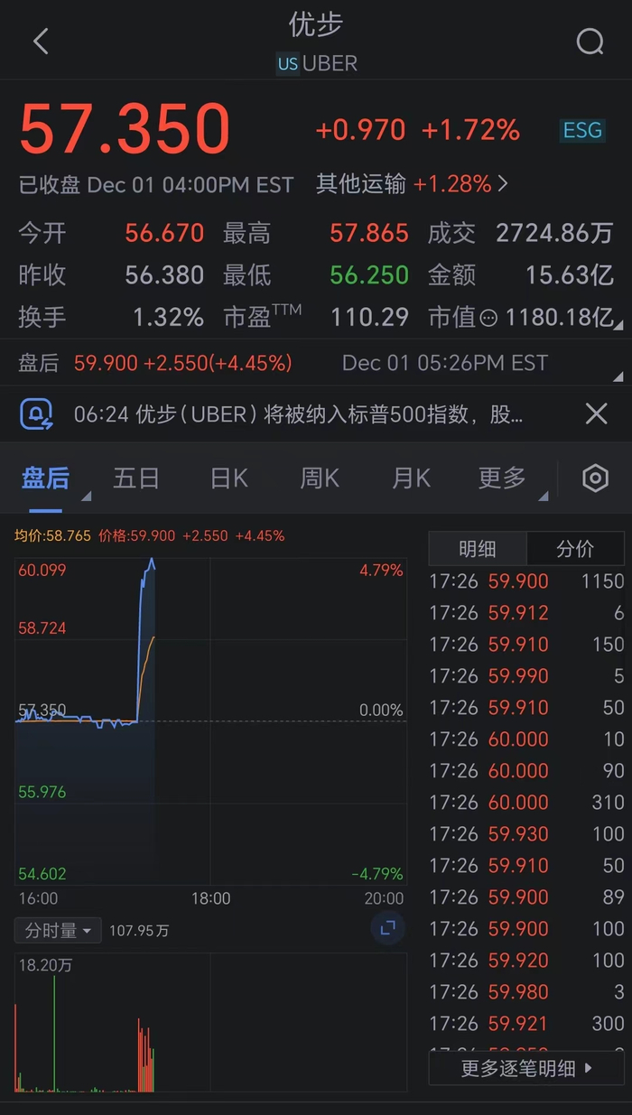 优步(UBER)将被纳入标普500指数,股价盘后涨4%。