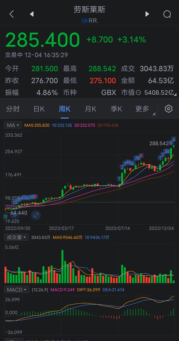 劳斯莱斯(RR/.LN)收涨3.14%,报285.40 p,逼近2019年9月13日收盘位285.447 p和当年7月30日收盘位305.831 p,连续第八个交易日上涨——期间累计上涨20.17%,2023年迄今已经累计上涨超206.22%。摩根大通上调对这家飞机引擎生产商的评级至超配——最近九年来首次,分析师David Perry现在给出的目标价为400 p;高盛重申其买入评级,分析师Victor Allard的目标价370 p。