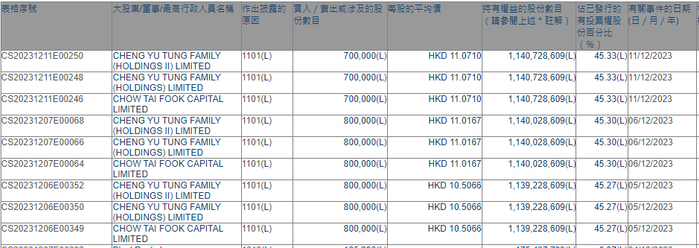 港交所文件显示,香港亿万富豪郑家纯(郑裕彤长子)家族12月11日通过周大福资本(Chow Tai Fook Capital)以每股平均11.0710港元的价格买入70万股新世界发展股票,持股比例由45.30%增至45.33%,交易价值约为775万港元。