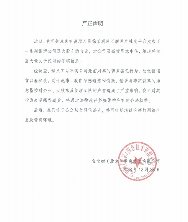 12月23日下午,宝宝树(北京)信息技术有限公司通过官方微博发布声明:关注到有离职人员徐某利用互联网及社交平台发布了一系列诽谤公司及大股东的言论,对公司及高管恶意中伤,编造并散播大量关于公司的不实信息。经调查,该员工系不满公司此前对其的职务罢免行为,故散播谣言以泄私愤。对于此事,我们深感遗憾和愤慨,诸多与事实背离的恶意指控对企业、大股东及管理团队的声誉造成了严重影响,公司对其行为表示强烈谴责,将通过法律途径坚决维护应有的合法权益。