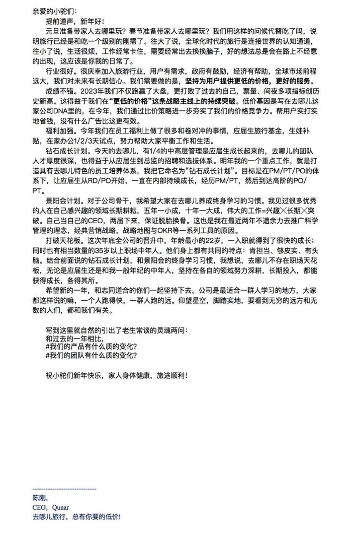 去哪儿CEO陈刚发布新年信,对外宣布2023年去哪儿不仅跑赢了大盘,更打败了过去的自己,机票预定量、酒店间夜量多项指标创历史新高。同时,陈刚表示2024年将启动“钻石成长计划”,打造具有去哪儿特色的人才培养体系。(新浪科技)