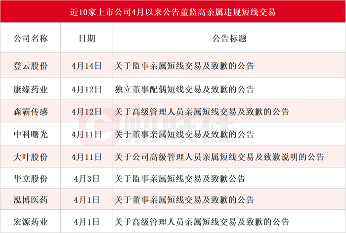4月迄今近10家上市公司公告董监高亲属违规短线交易
