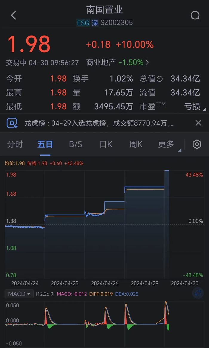 房地产开发板块持续活跃 南国置业4连板 媒体滚动 2024.04.30 09:29 房地产开发板块持续活跃,南国置业4连板,华远地产、荣盛发展涨停,京能置业、中国武夷、大龙地产等跟涨。 责任编辑:于健 SF069