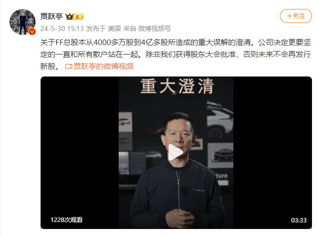 贾跃亭:除非获股东大会批准 否则未来不会再发行新股 媒体滚动 2024.05.30 15:15 贾跃亭在微博发布视频称:公司决定更要坚定的一直和所有散户站在一起。除非我们获得股东大会批准,否则未来不会再发行新股。